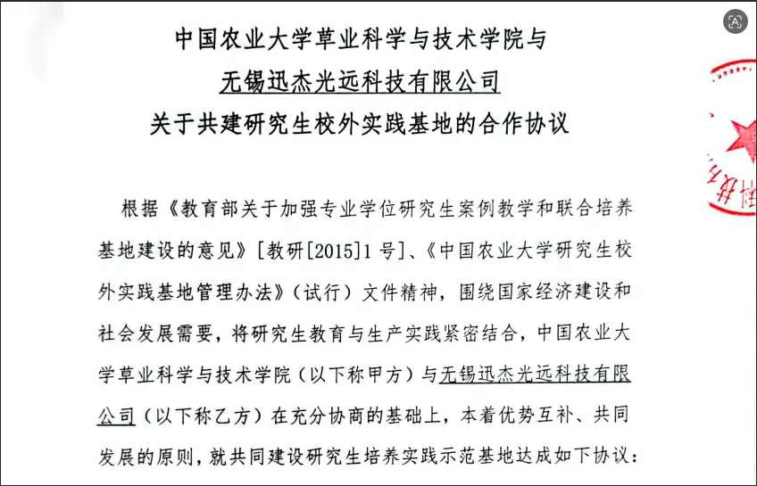 根据协议,双方将充分发挥各自在科研攻关、技术转化与人才培养方面的优势,围绕近红外光谱分析技术、智慧农业、饲草饲料快速检测等领域,共同打造产教融合的实践育人平台。迅杰光远将为研究生提供贴近产业一线的实践项目与导师资源,中国农业大学则为基地建设提供学科与科研支撑。